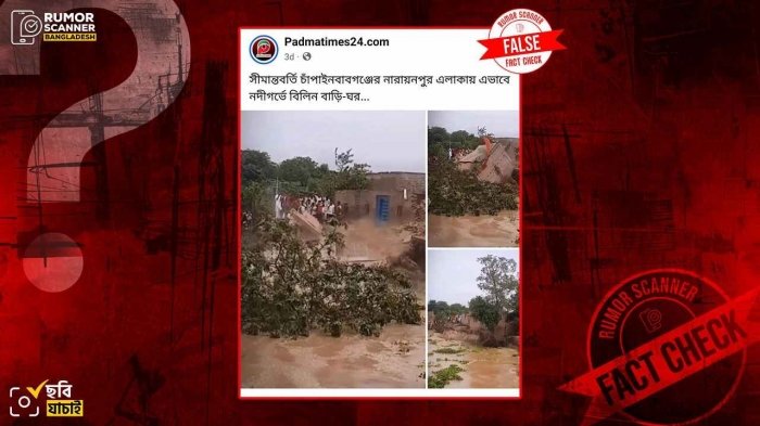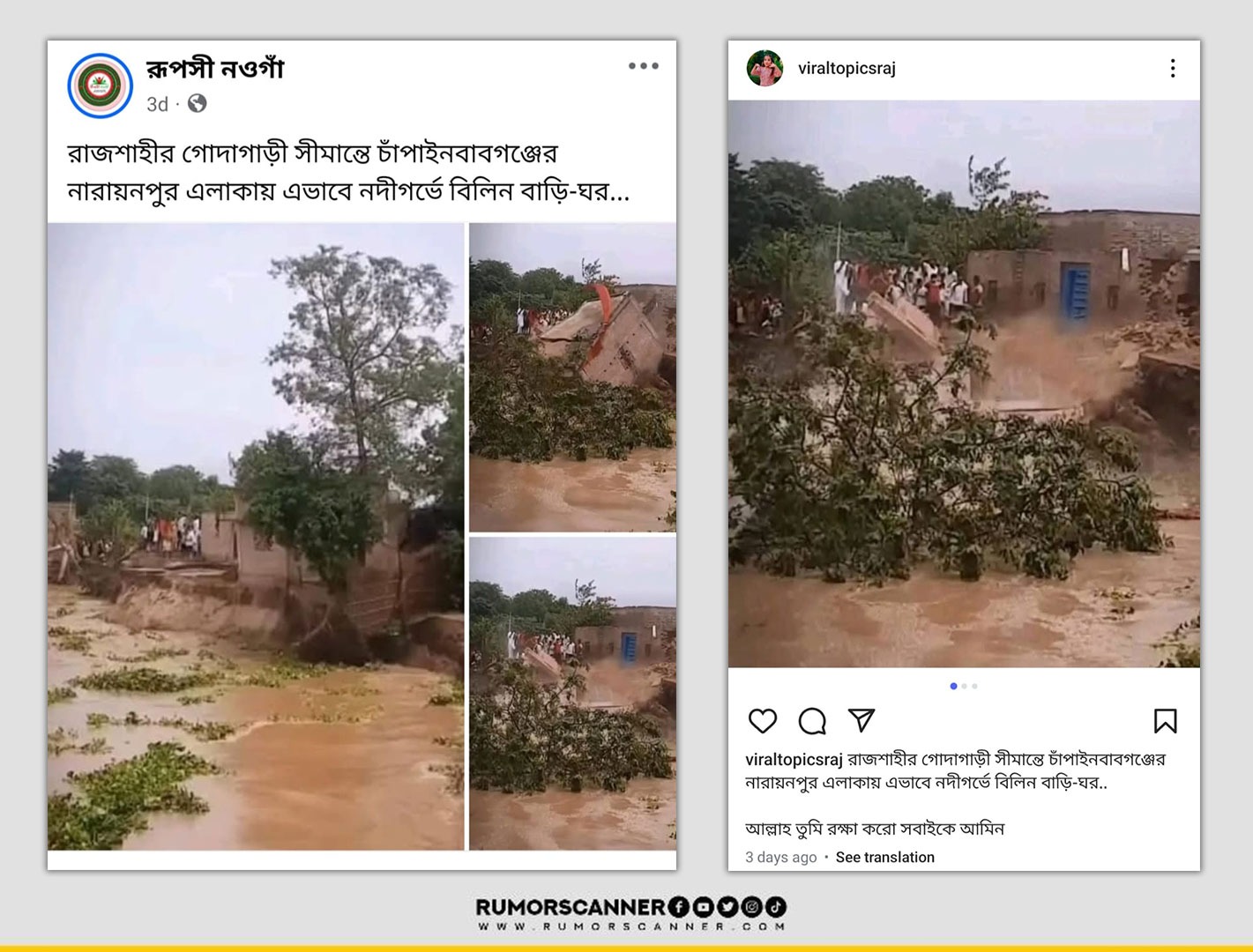 এরই প্রেক্ষিতে ‘রাজশাহীর গোদাগাড়ী সীমান্তে চাঁপাইনবাবগঞ্জের নারায়নপুর এলাকায় এভাবে নদীগর্ভে বিলিন বাড়ি-ঘর…’ ক্যাপশনে একাধিক ছবি সামাজিক যোগাযোগ মাধ্যমে প্রচার করা হয়েছে।
