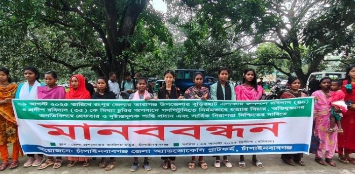 রংপুর জেলার তারাগঞ্জ উপজেলার বুড়িরহাট এলাকায় রুপলাল রবিদাস (৪০) ও প্রদীপ রবিদাস (৩৫) কে মিথ্যা চুরির অপবাদে গণপিটুনিতে নির্মমভাবে হত্যার বিচার, অভিযুক্তদের অনতিবিলম্বে গ্রেপ্তার ও দৃষ্টান্তমূলক শাস্তি প্রদান এবং ভূক্তভোগী পরিবারের সার্বিক নিরাপত্তা নিশ্চিতের দাবিতে মানববন্ধন করেছে চাঁপাইনবাবগঞ্জ জেলা অ্যাডভোকেসি প্লাটফরম।